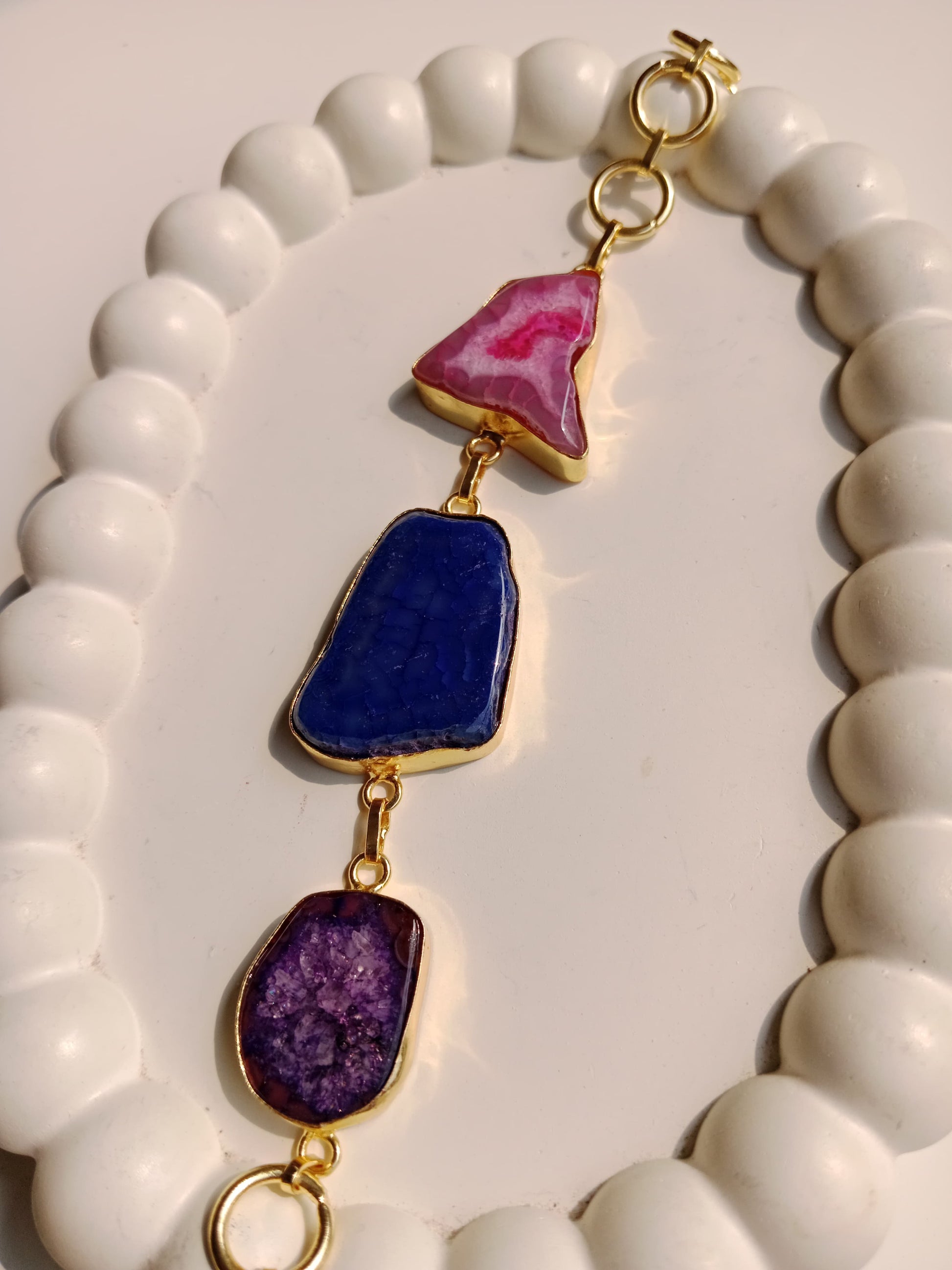 Bold, vibrant, and one of a kind — this statement bracelet features natural onyx slices in stunning hues of blue, aubergine and pink. Each stone is uniquely cut and gold-plated to enhance its raw charm. Designed to turn heads and elevate everyday elegance, this bracelet adds a playful yet powerful pop of color to your wrist.